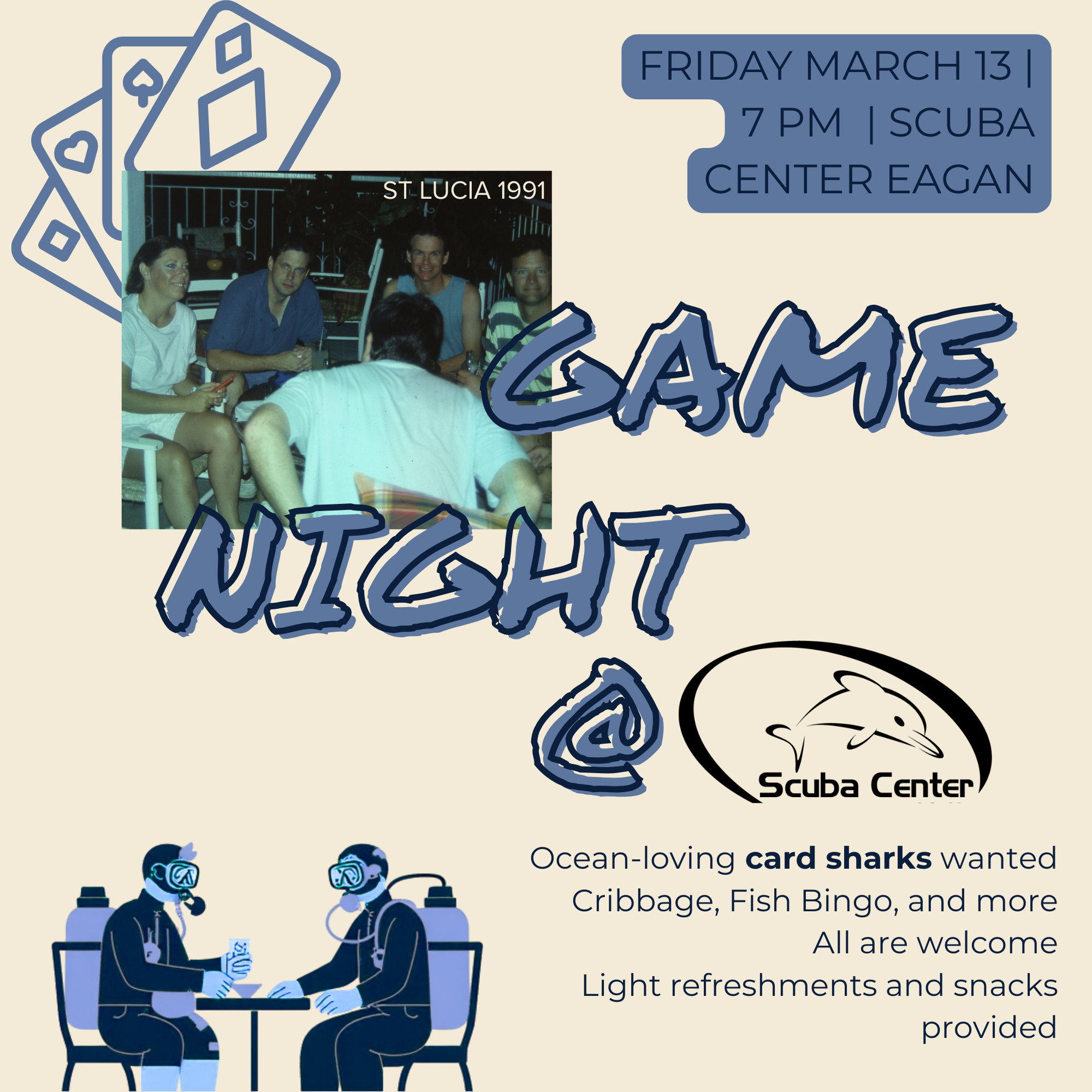 Game Night Friday, March 13, 2026 7:00 PM 9:30 PM Scuba Center Eagan 1571 Century Point Eagan, MN, 55121 United States (map) Google Calendar ICS